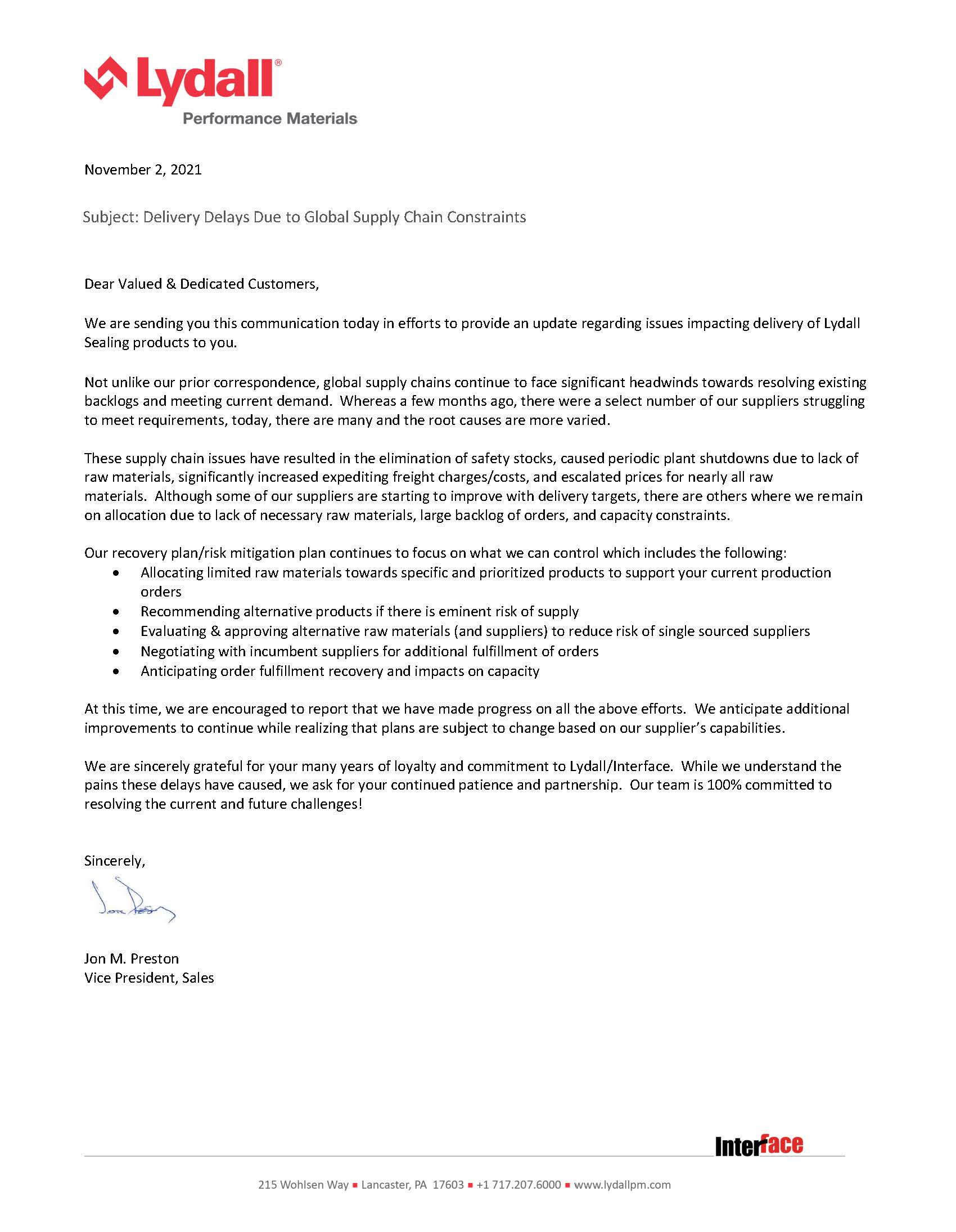 關(guān)于CMP-4000等InterFace材料延期交貨的通知
